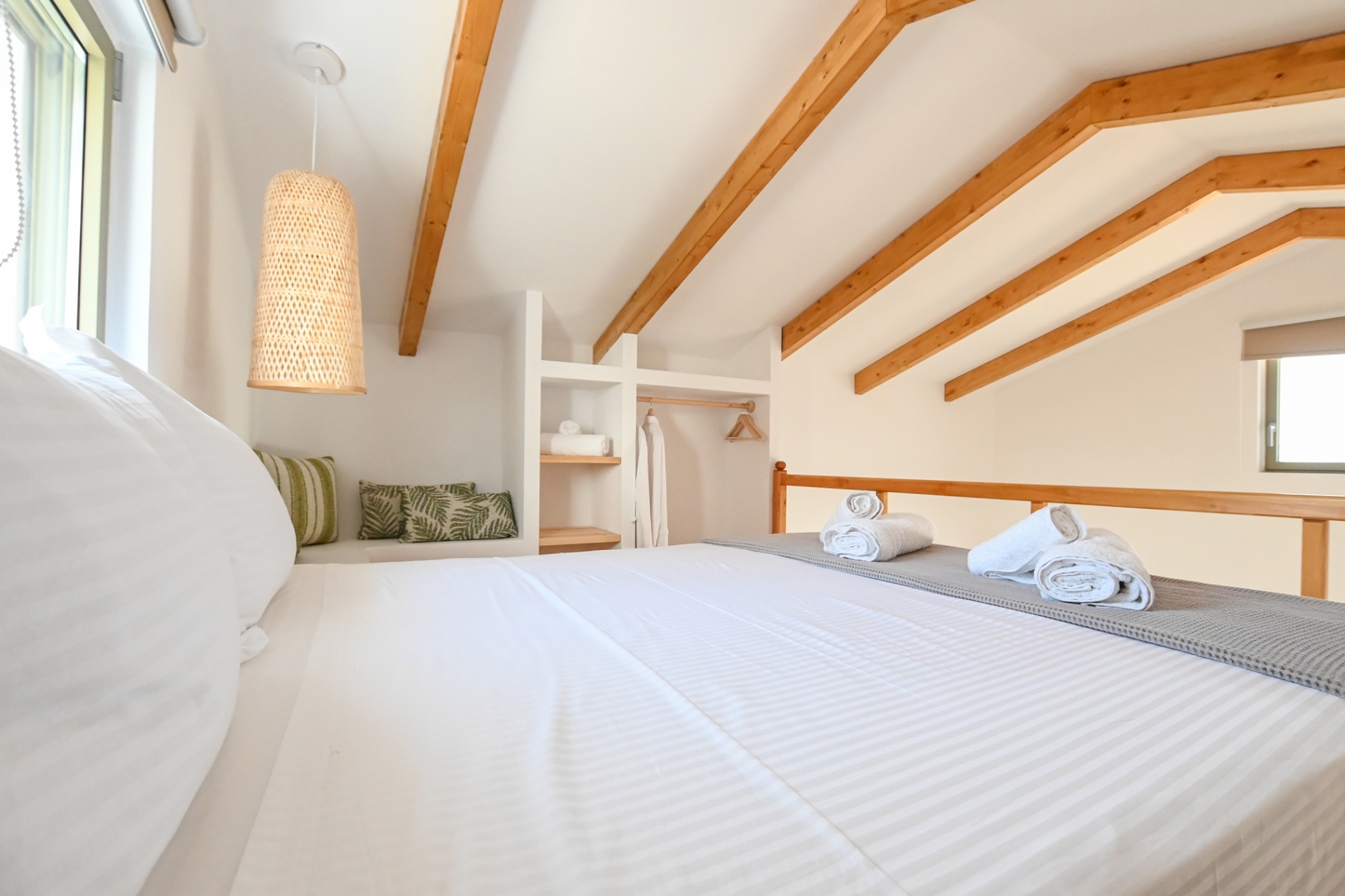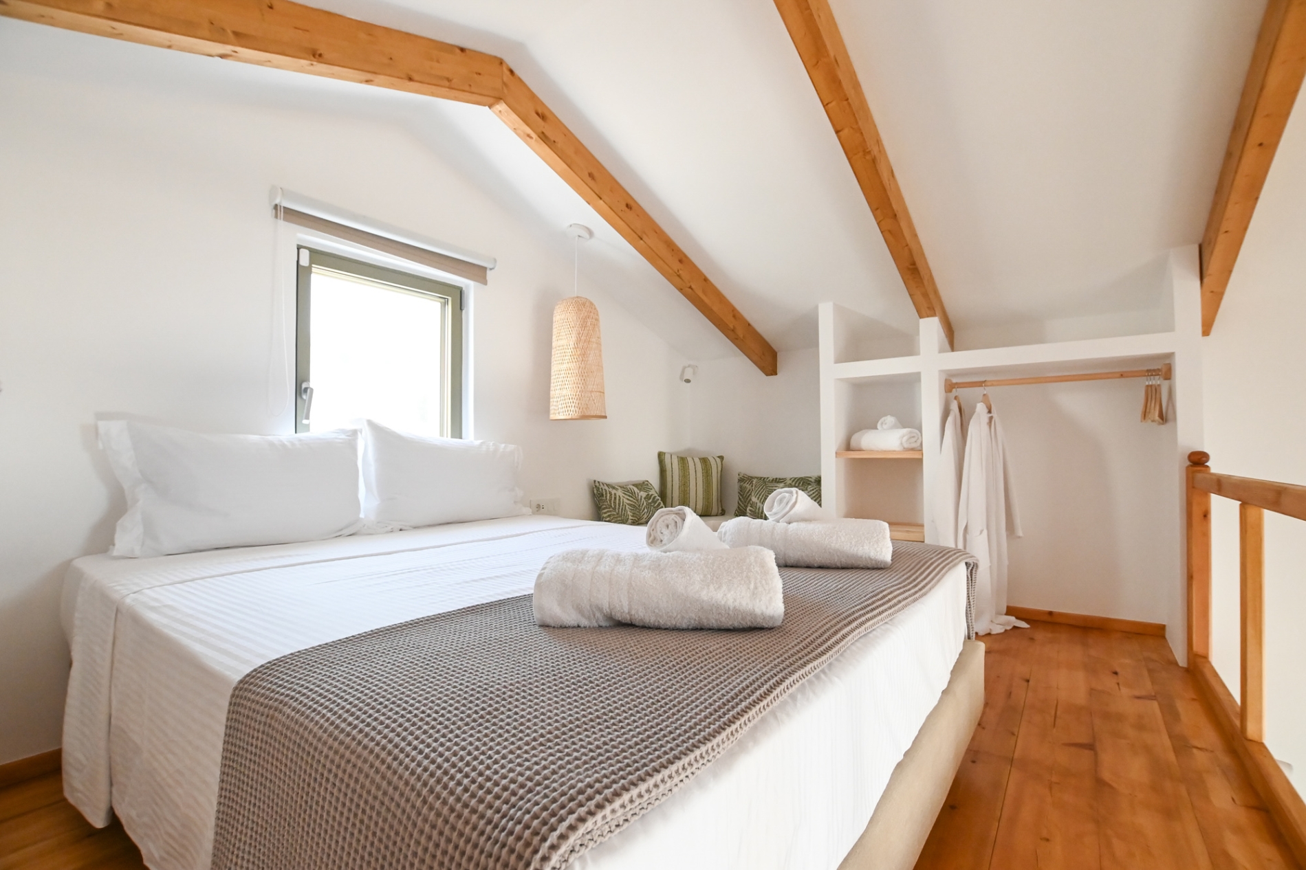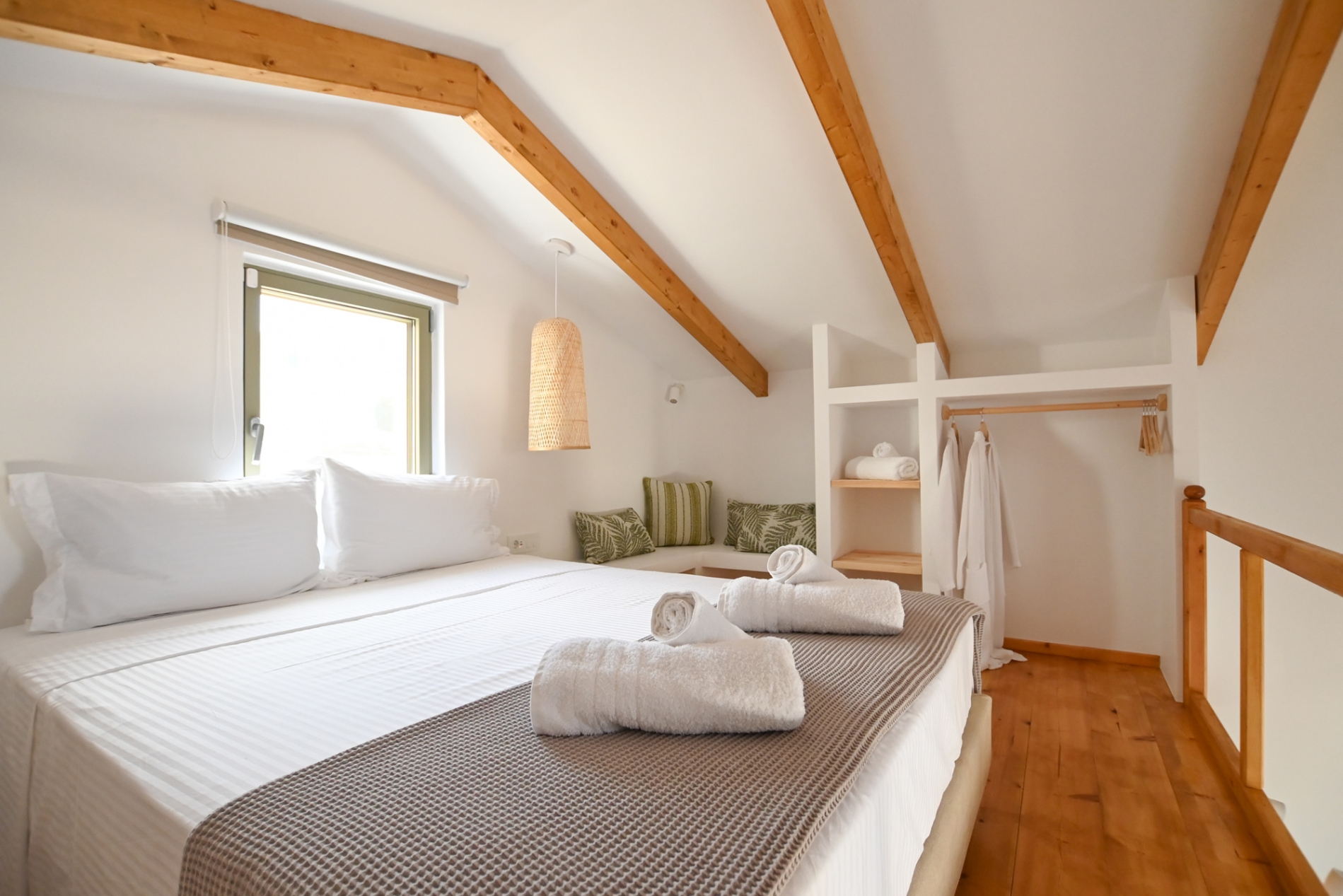 • Peaceful Loft Retreat - King-size bed, closet, clothes rack, mosquito net, and sea view. The beds and linens are provided by renown Cocomat, ensuring a natural and high-quality sleeping experience.