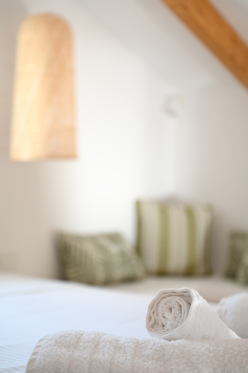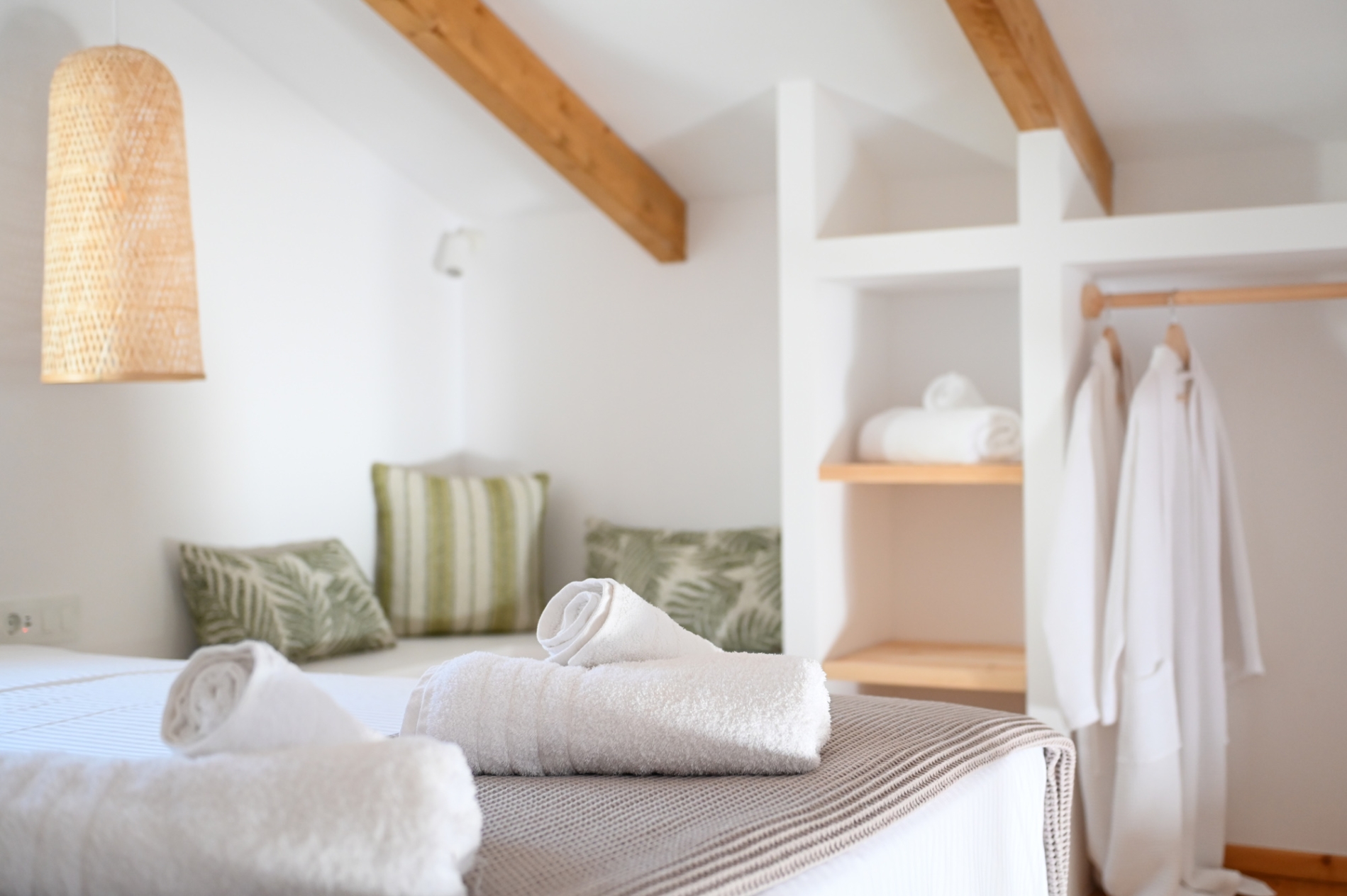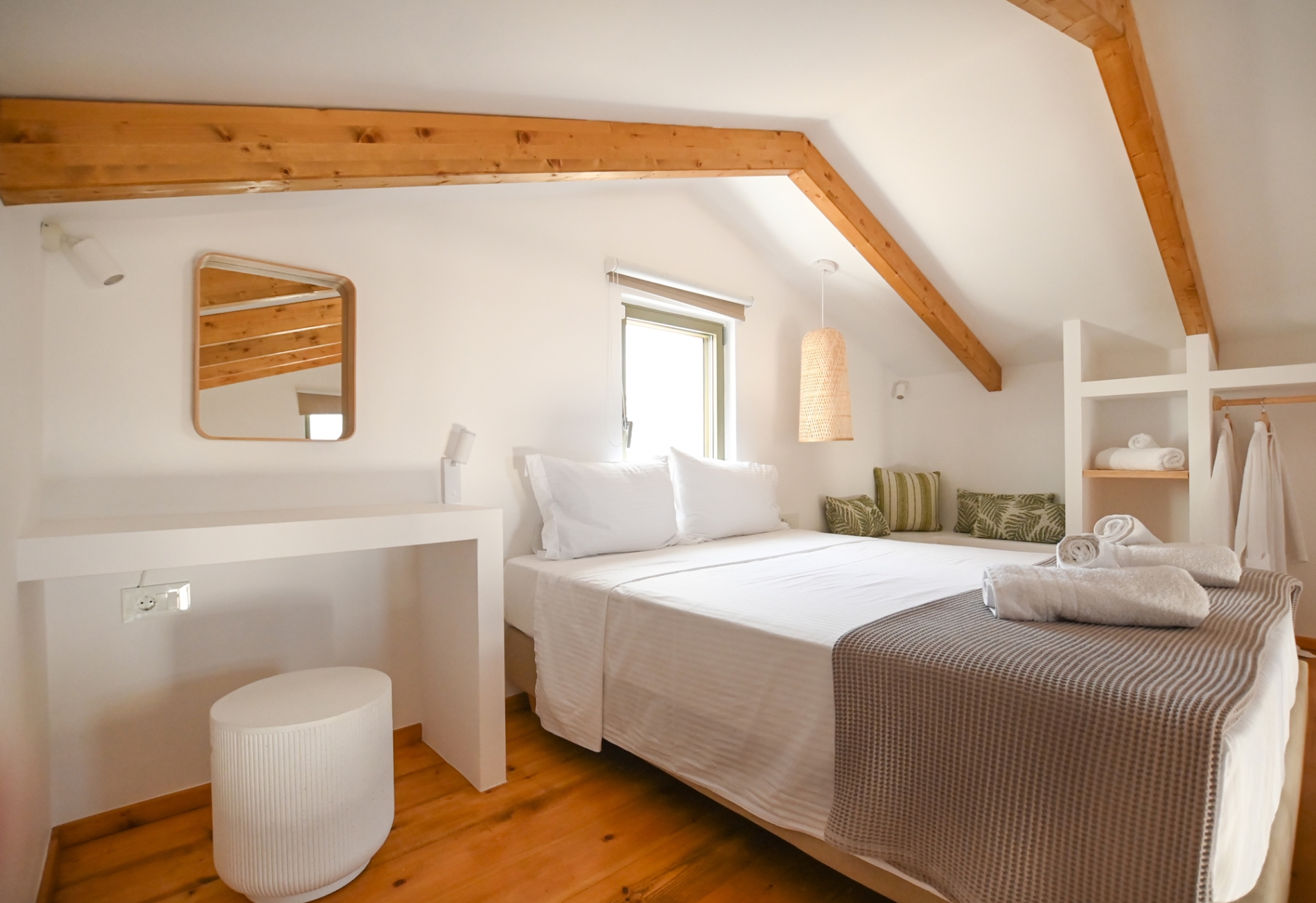 • Peaceful Loft Retreat - King-size bed, closet, clothes rack, mosquito net, and sea view. The beds and linens are provided by renown Cocomat, ensuring a natural and high-quality sleeping experience.
